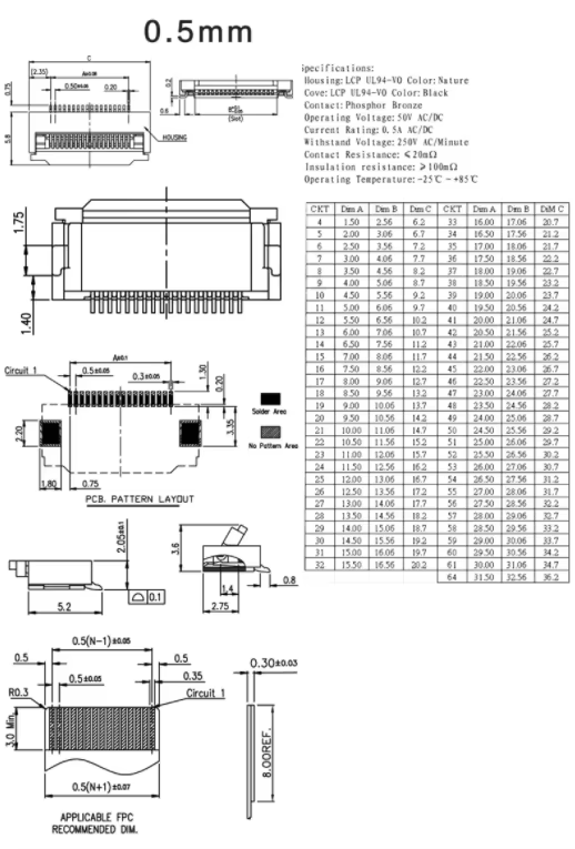 Conector FPC/FFC 8 vias com passo de 0,5 mm